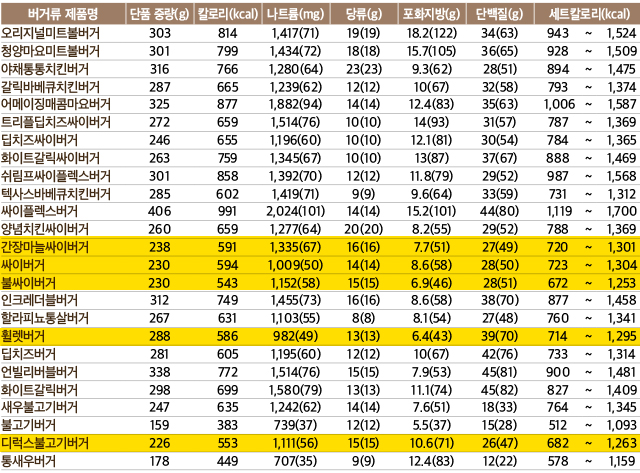 일단 단백질이 20g이상인 버거류를 살펴보았더니