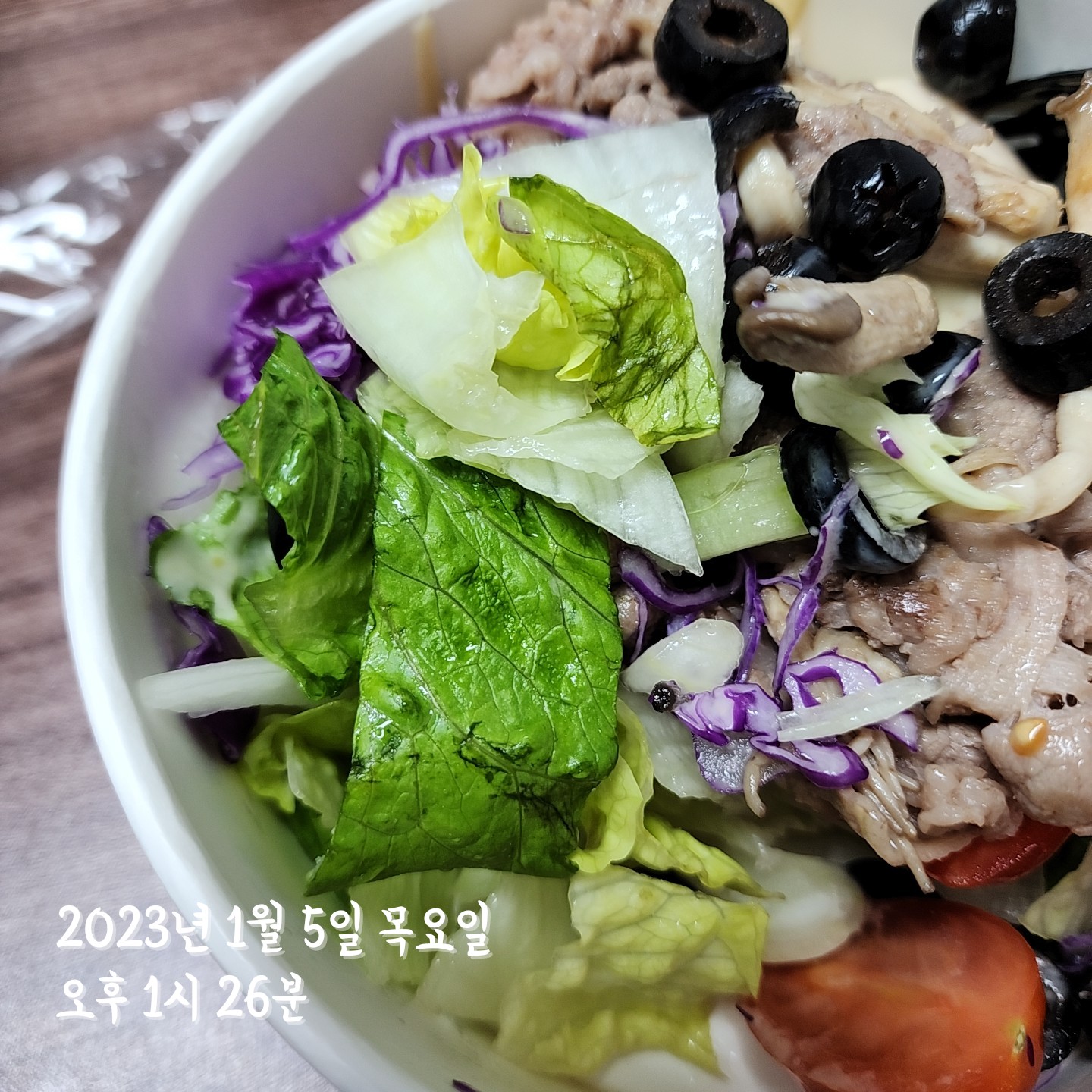 그 외에 눈에 보이는 야채는 방울토마토, 올리브, 적양배추, 양파, 양상추, 오이다.