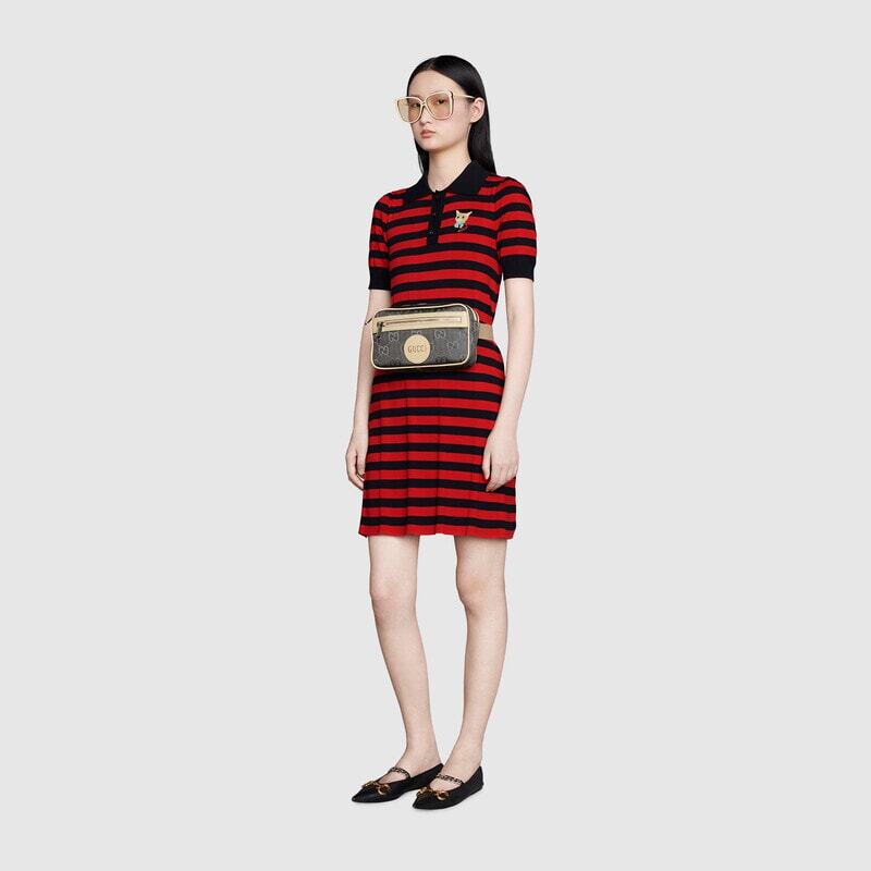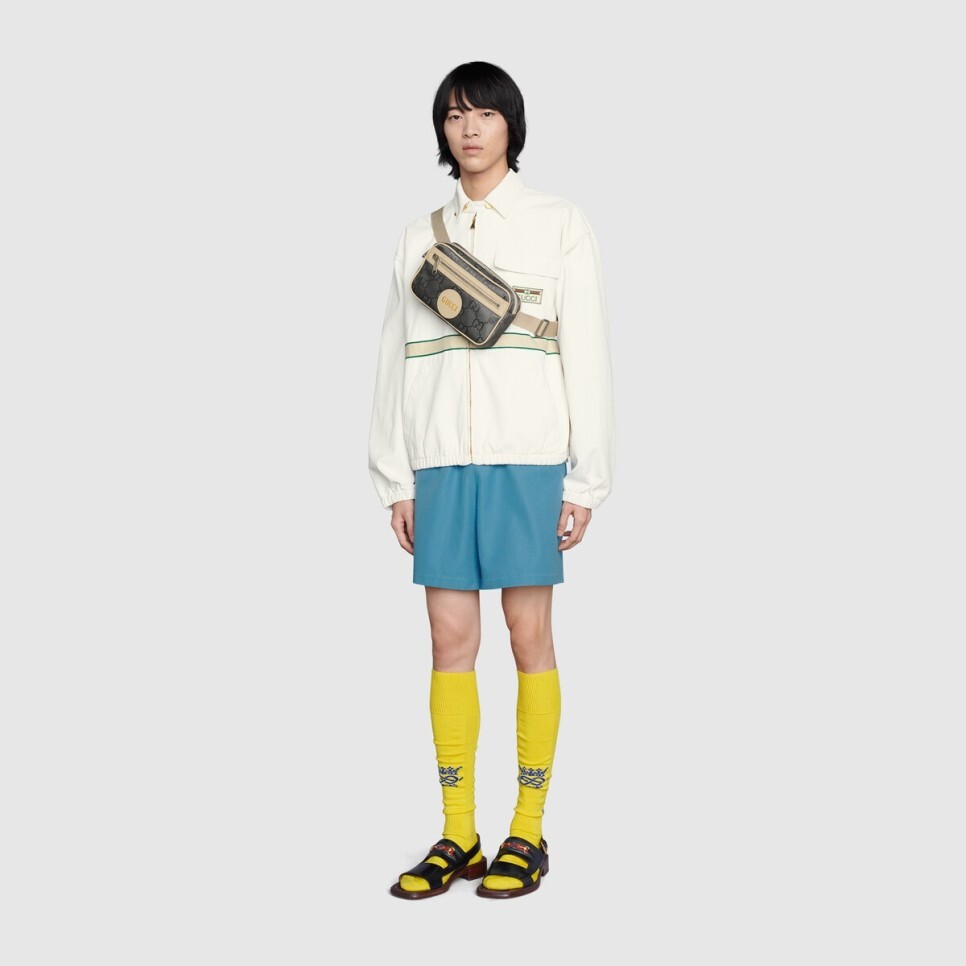 재생 소재 및 트리밍으로 제작된 패션소품 및 레디-투-웨어 라인으로 지속 가능성에 대한 하우스의 신념을 표현함. 환경에 대한 영향을 고려하여 재활용 소재 및 유기농, 친환경, 지속 가능한 소재를 사용한 구찌 오프 더 그리드 디자인. 불투명한 비브런트 옐로우 바탕에 재생 원사와 트리밍을 이용한 재생 나일론으로 구현한 GG 패턴. 조절 가능한 버클 클로저 및 앞면 지퍼 포켓으로 완성되는 벨트백.